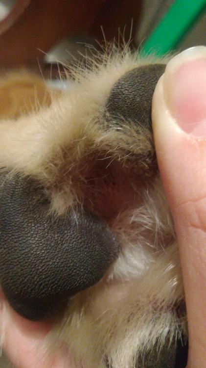 Подстилка животного всегда должна быть чистой и сухой, ее регулярно меняют. После мойки лап или купания пса тщательно вытирают, жидкость не должна скапливаться между пальцами лап. Шерсть вокруг подушечек лучше срезать.