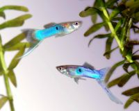 - Японская голубая. Эта разновидность гуппи отличается красивой голубой чешуей с неоновым отблеском. На теле или голове могут также присутствовать характерные темные пятнышки.