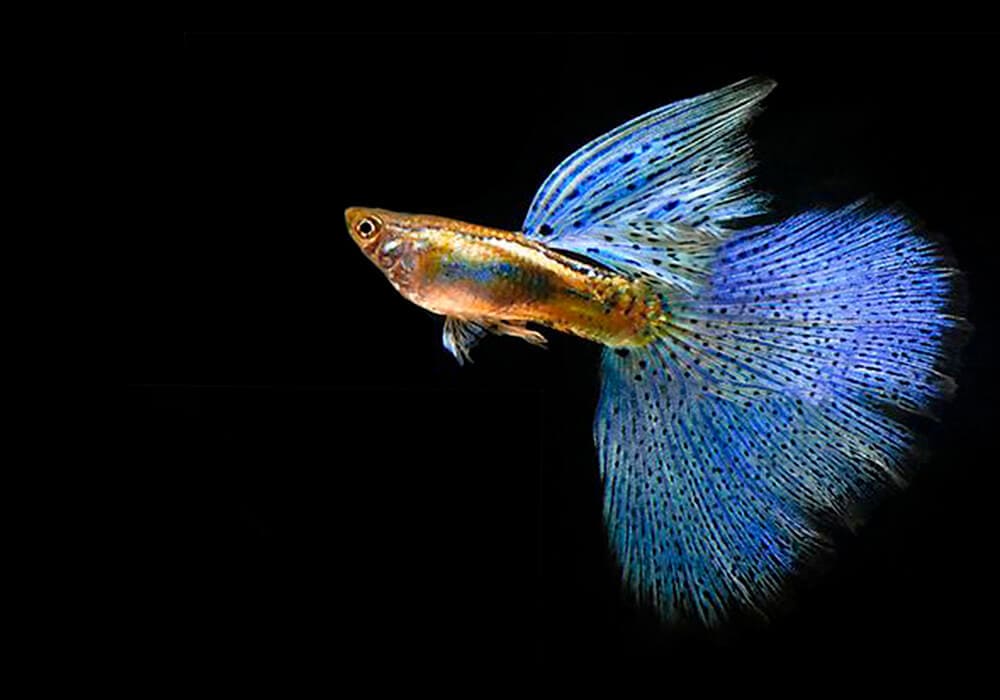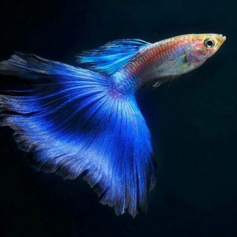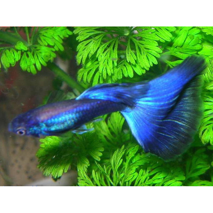 Настоящая голубая гуппи, как правило, является шоу-стоппером — она имеет ярко-синий окрас, иногда с оттенками небесно-голубого и темно-синего, что приводит к поразительному внешнему виду и разнообразию внутри самой линии.