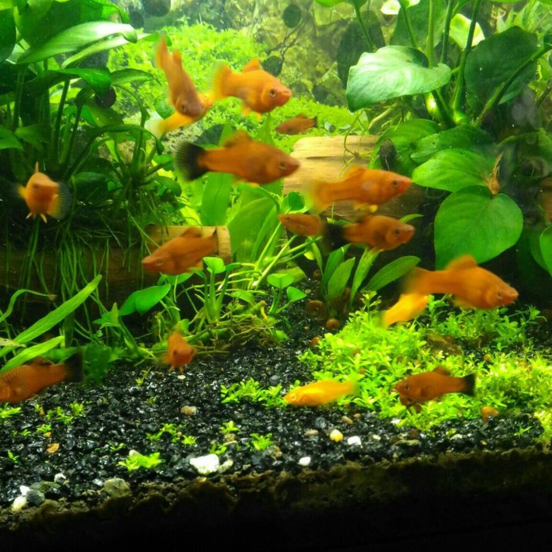МоллинезииМеченосцы отлично уживаются в одном аквариуме с родственниками по семейству – моллинезиями. Эти рыбки обладают почти одинаковым размером и требуют сходных условий содержания. Рыбки черного цвета и красных оттенков смотрятся в одном аквариуме особенно красиво. Пострадать от меченосцев могут только мальки моллинезий, поэтому самок, готовых принести потомство, лучше отсадить.