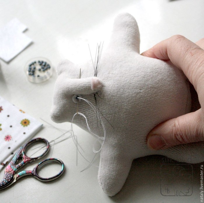 Кадр: @Let’s make it together / YouTubeОтрежьте лишнюю ткань и выверните деталь. Набейте тело котика наполнителем и зашейте отверстие внизу.