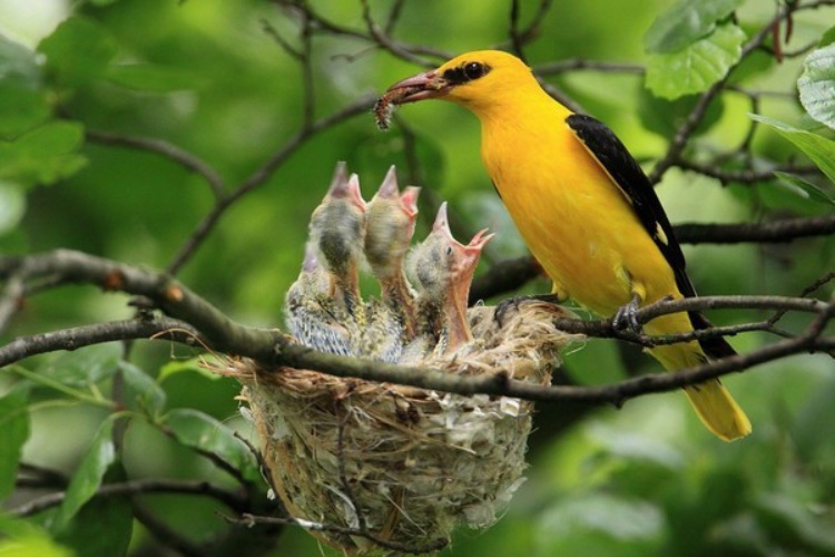 Как уже говорилось выше, в природе эту чудесную птичку заметить очень трудно. Иволга — птица боязливая и осторожная. Поэтому она придерживается густой листвы и только на очень высоких деревьях! Там она и гнездует.