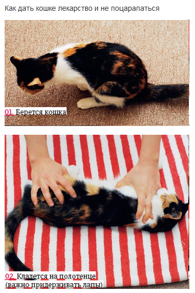 Во избежание вышеупомянутой ситуации, мы рекомендуем Вам провести предварительную фиксацию кошки, что заметно упростит процесс дачи лекарств и сведет к минимуму вероятность получения травм.