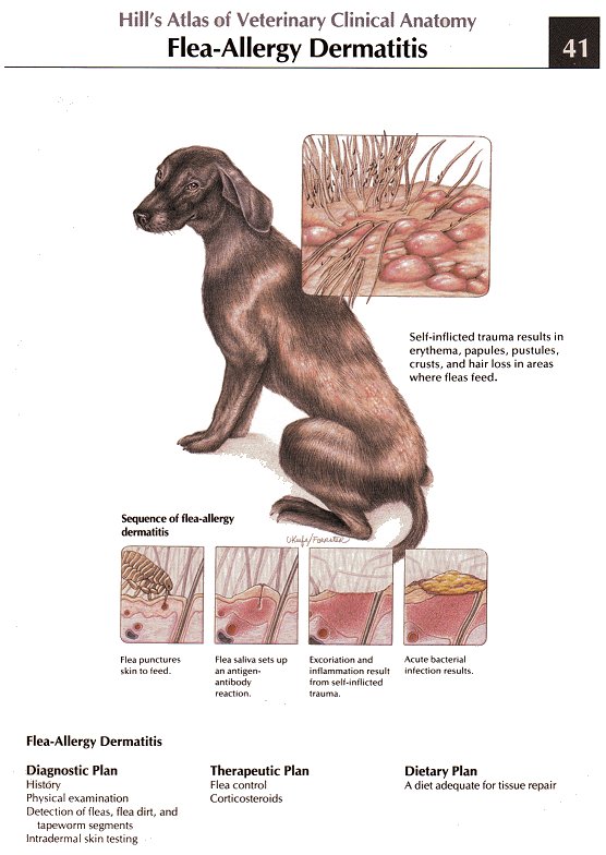Если на животном были обнаружены следы пребывания блох, проводится контрольная обработка противопаразитарными препаратами. При сохранении симптомов собака на 1-2 месяца переводится на диагностическую диету. Рацион подбирается таким образом, чтобы он состоял исключительно из продуктов, которые животное ранее не употребляло. Зачастую используют рис и баранину. Если через несколько недель зуд исчезает, проводят провокацию – собаку возвращают на ее обычный рацион.