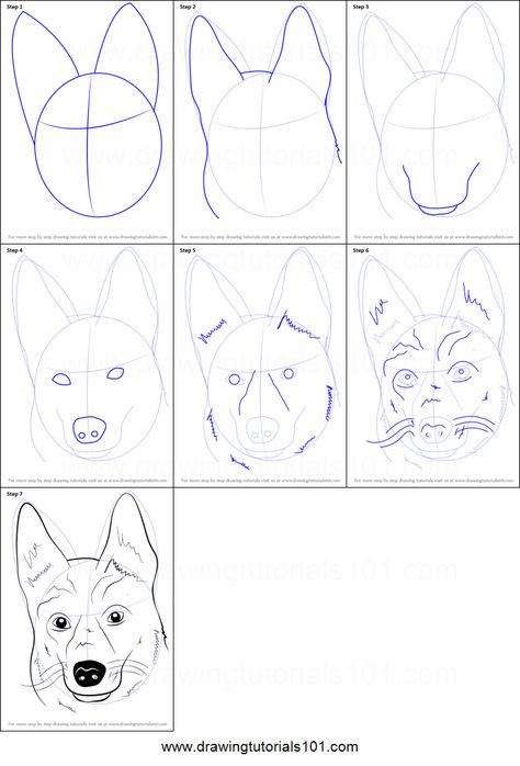 - Нарисовать очертания головы собаки, прорисовать уши и заднюю часть шеи. Нарисовать брови.