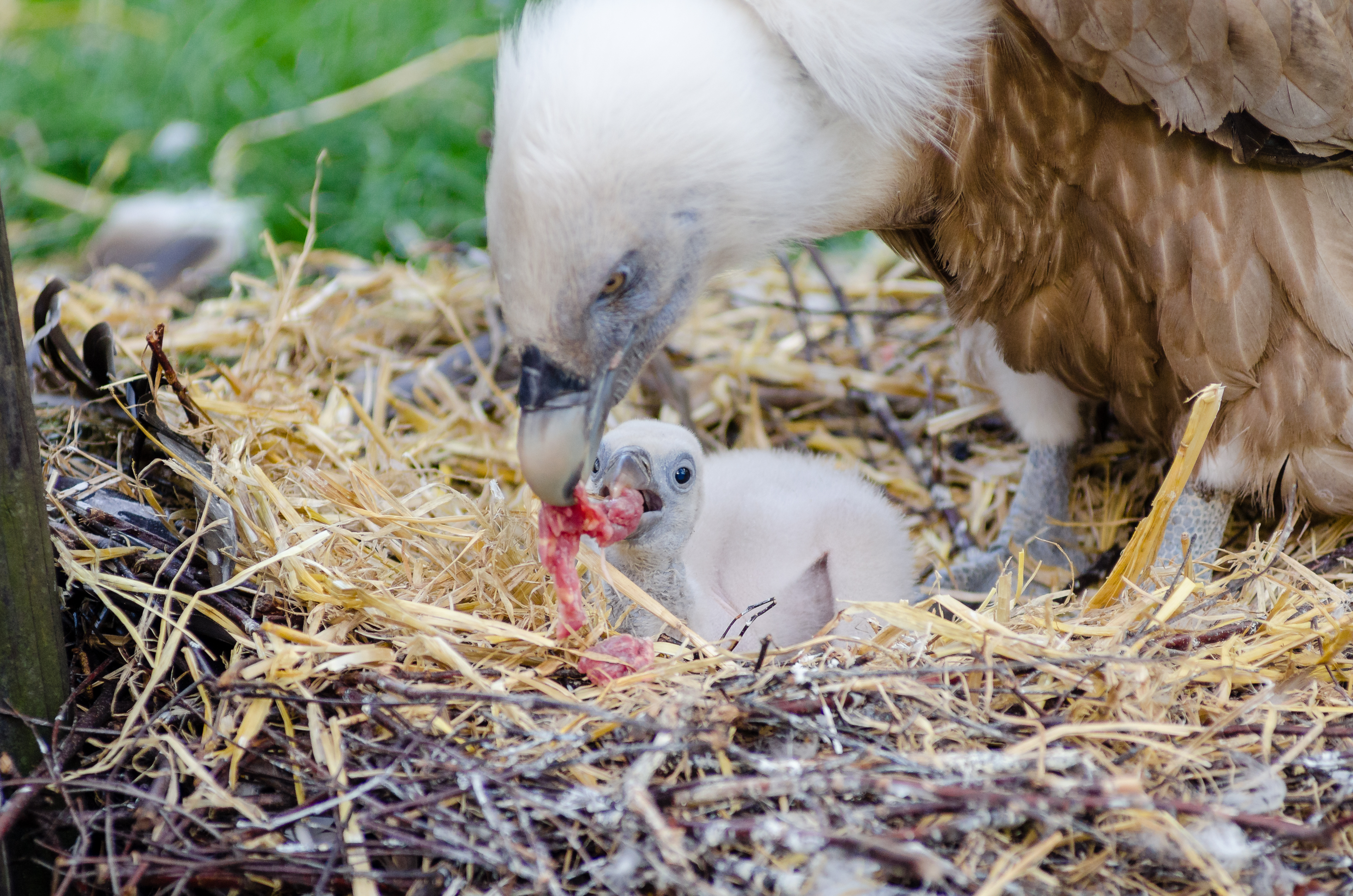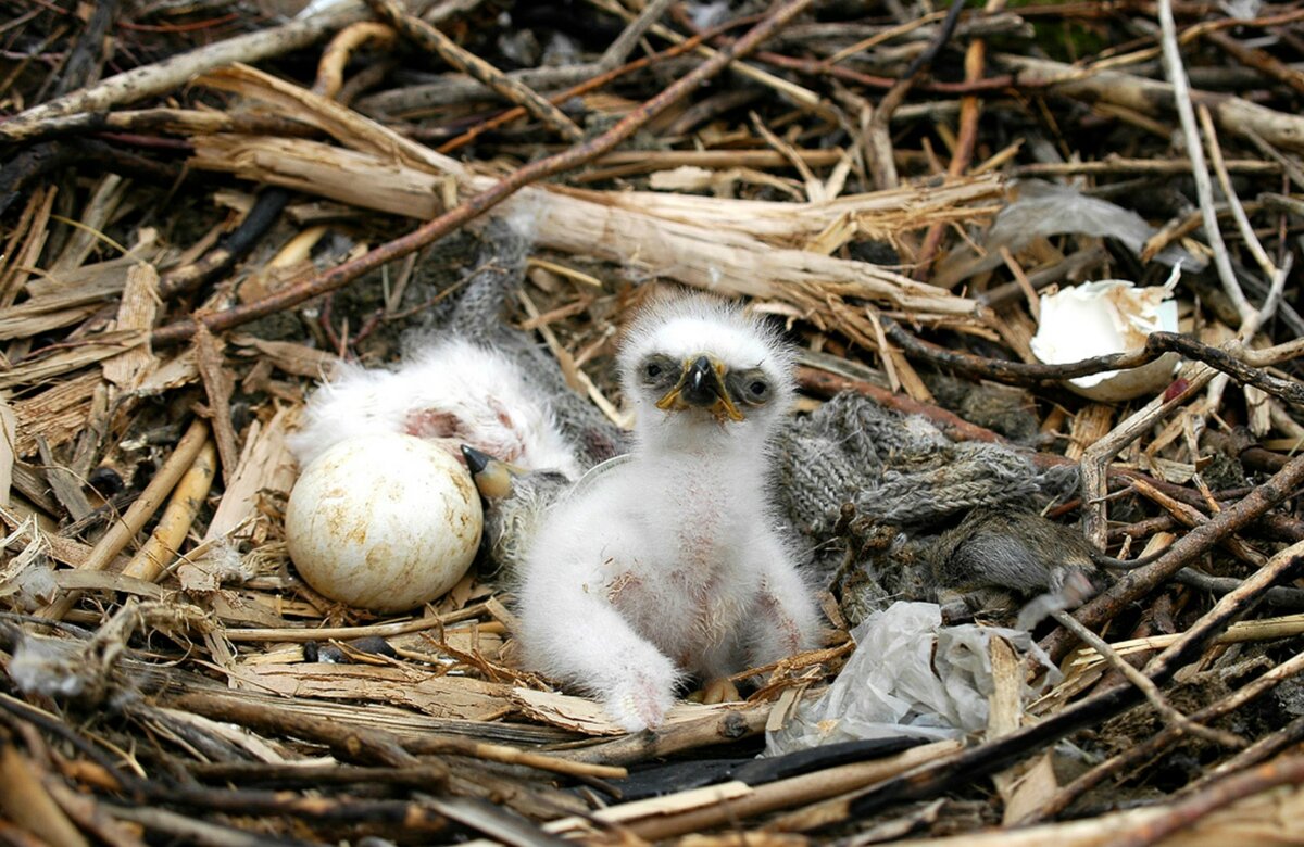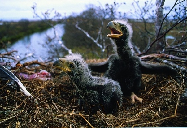 Орлята уже через 3-4 недели начнут рвать и есть свою еду — родители просто сбрасывают добычу в гнездо и позволяют им заниматься этим.