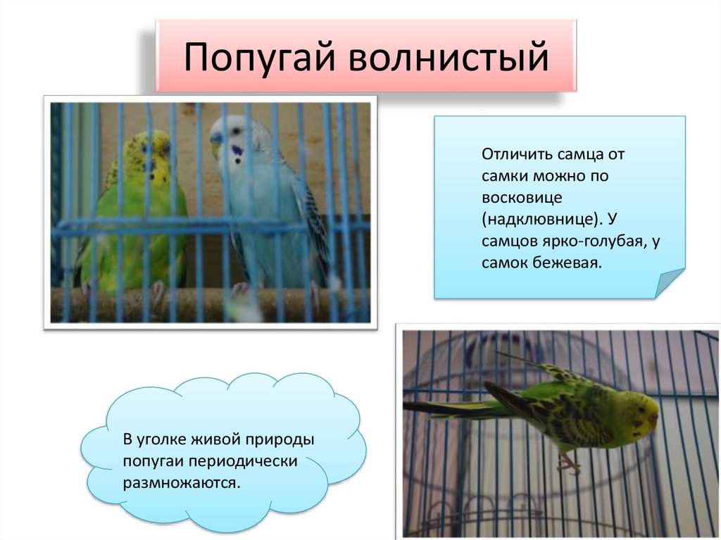 Наилучший сценарий — совместимый партнер противоположного пола, но для начала вам нужно знать пол вашей птицы. Итак, как определить, является ли попугайчик самцом или самкой? Поскольку волнистые попугайчики, как правило, сексуально диморфны, то есть самцы и самки обладают физическими характеристиками, которые отличают друг от друга, это относительно просто, просто взглянув на них.Взрослые волнистые попугайчики-самцы обычно имеют голубые хлопья (мясистая область над клювом, окружающая ноздри), как у волнистых попугаев слева на картинке выше, в то время как зрелые самки волнистых попугаев имеют хлопья телесного цвета (от белого, розового, бежевого до белого). коричневый), как показано самкой волнистого попугайчика справа на картинке выше.