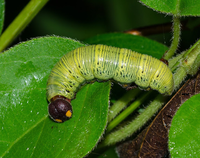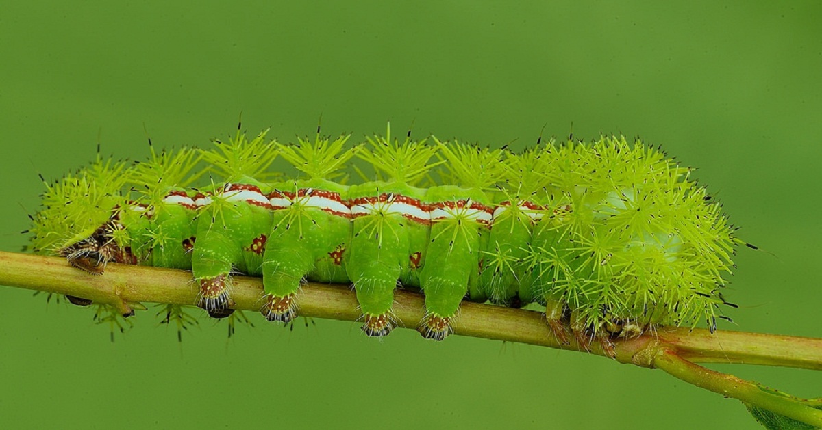 Хищники чаще нападают на гусениц, чем на бабочек. Поэтому на жизненном этапе в виде гусеницы многие из них имеют устрашающую окраску. Этот зеленый инопланетянин родом из Филиппин. Кажется, что его голова довольно большая и жуткая, но это лишь эффект от поддельных глаз, пятен с соответствующей окраской. Как правило, голова гусеницы намного меньше, и не расположена в брюшной части.