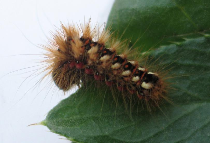 Описание: Черный с длинными коричневыми волосами, двумя красными пятнами сверху и линией белых отметин по бокам. Встречается в заметных общих сетях на пищевых растениях. Волосы вызывают раздражение кожи.