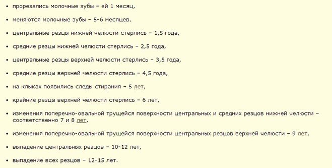 Через семь лет изменения начнут поперечно овальной трущей поверхности центральных резцов нижней челюсти, через восемь лет — средних резцов нижней челюсти, через девять лет — центральных резцов верхней челюсти.В 10-12 лет выпадают центральные резцы, к 12-15 годам выпадают все резцы.