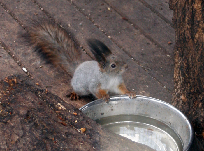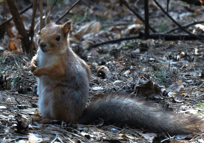 Окрас белки бурого или серого цвета. Основное место дислокации зверька – это лес. На жировку выходит днём.