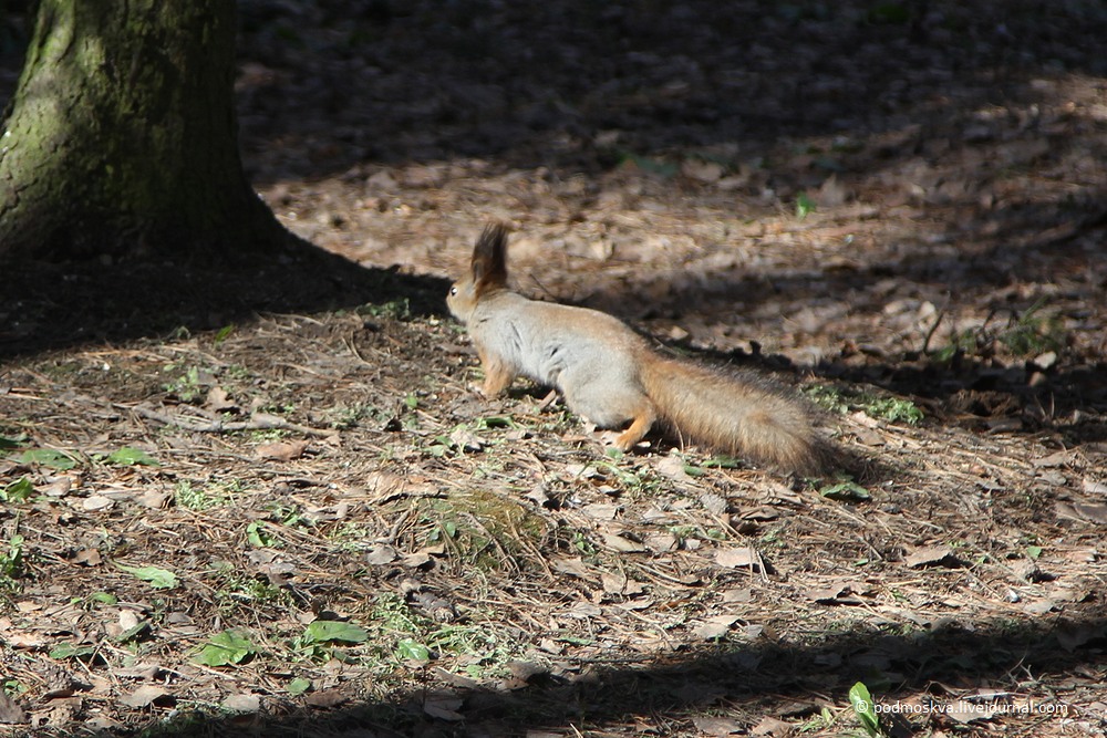 След белки на земле читается по отпечаткам лап. Обращать внимание следует на грязь или лужицы, где хорошо виден след. Летом, отпечаток отдалённо напоминает крысиный след. Дело в том, что белка в это время года не обросла пушком.