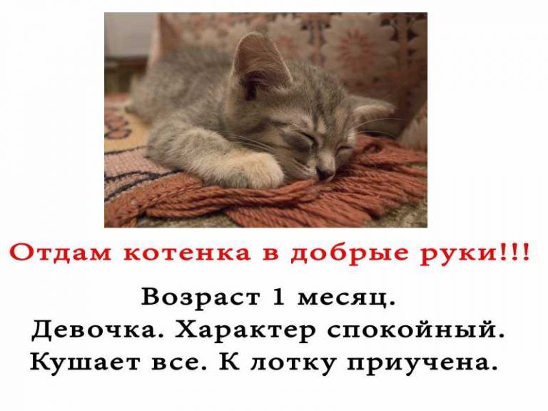 Стоит воспользоваться этой возможностью найти котенку дом. Найдутся люди, что обратят внимание на такое сообщение и захотят забрать котенка к себе. Здесь лучше придерживаться нескольких правил. Необходимо указать в таком объявлении номер телефона или электронную почту, по которой можно связаться с владельцем. Не помешает поместить фотографии самих котят или котенка. Фото делают после рождения котят, поэтому некоторое время придется потерпеть с кошачьим кланом. Либо можно поместить на сайтах фото самой кошки-матери, подробно описав ожидаемое потомство.