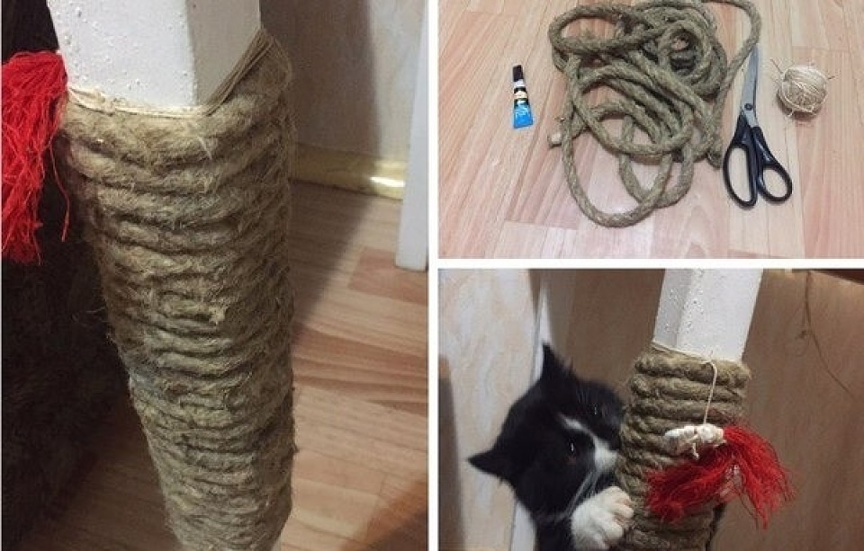 Кошке понравится игровой комплекс из нескольких столбиков, домика и гамака. Оплетённые верёвкой дощечки обладают максимальной мобильностью и нейтрально смотрятся в интерьере. Можно порадовать питомца и сделать когтеточку своими руками, используя некоторые подручные средства.