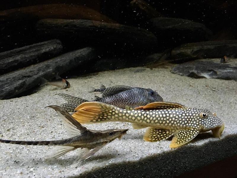 Птеригоплихты. Самая популярная разновидность — паригоплихт парчовый. Это крупный пестрый вид, может достигать до 50 см в длину. Резервуар также должен быть от 100 литров, причем паригоплихтов в нем должно быть только несколько.