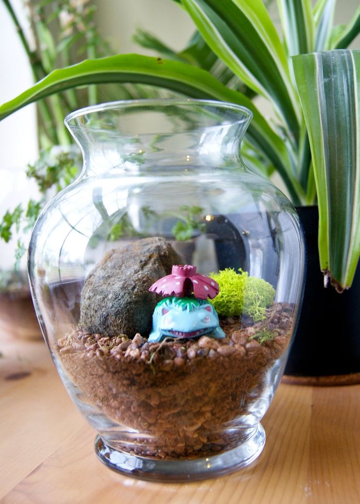 Используйте ту же формулу слоев для создания террариумов своими руками из любого подходящего контейнера. У нас был один из старого стоячего автомата с жевательной резинкой, который я обожал (а потом мои дети посадили в него гусеницу, и эта чертова гусеница съела все — дополнительное примечание, не добавляйте жуков в свой террариум!).