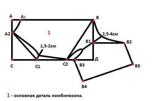 Внутренняя часть штанишек комбинезона выкраивается отдельно , повторяя детали выкройки нижней части чертежа комбинезона.