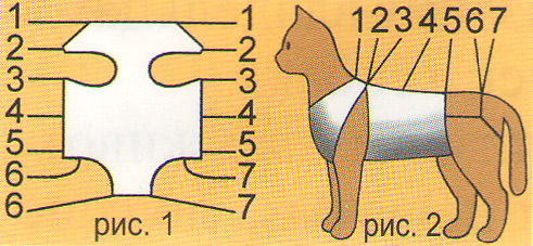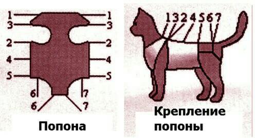 Подобный бандаж или жилетка шьётся из лёгких, но прочных и впитывающих тканей — ситец, хлопок, поплин, бязь. Послеоперационная попонка должна хорошо облегать тело, но не давить на швы. Рекомендуется приобрести и вторую (сменную) жилетку.