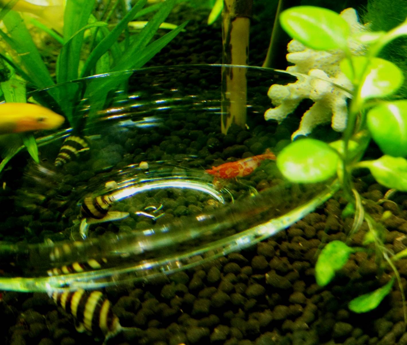Также рекомендуется использовать лоток для кормления при кормлении креветок. Это предотвратит потерю лишнего корма в субстрате и сохранит остальную часть аквариума чистой от остатков пищи. Это также хороший способ понаблюдать за рыбками.