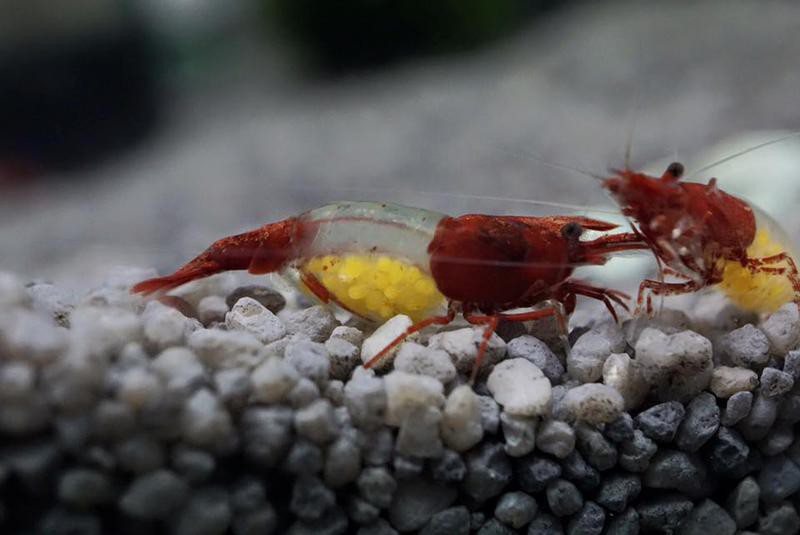 Обычно самка креветки вишни вынашивает 20-30 икринок, в течение 2-3 недель. Икринки желтые или зеленоватые, по мере созревания они становятся все темнее и темнее.