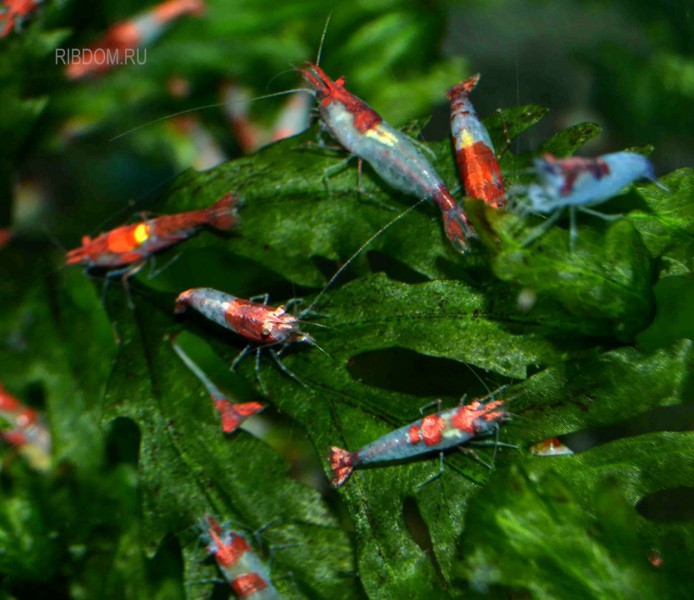 Также яркость красного цвета в окраске зависит от кормов, живые и замороженные корма делают их ярче, а обыкновенные хлопья наоборот. Впрочем, можно давать специальные корма для креветок, усиливающие красный цвет.
