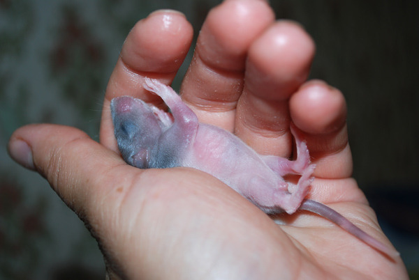 Новорожденные малыши очень трогательные на вид. Они розового цвета, у них почти прозрачная кожа и очень большие глаза. Если глаза видны сквозь кожу и они в виде темных шариков, то и у зверька в будущем будет темная шерстка. Если глаза разглядеть сложно, потому что они почт в тон с кожей, то можно полагать что окрас крысы будет рыжий или светлый.