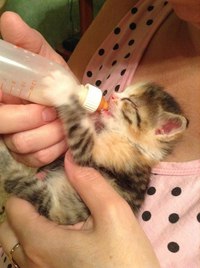 Третье: кормите животное до насыщения. Если после нескольких подходов котенок сопротивляется соске, не кормите его насильно. Также помните, что животное при кормлении должно лежать на животе и ни в коем случае не на спине, иначе смесь попадет в дыхательные пути. После кормления слегка помассируйте живот котенка и промежность, чтобы стимулировать дефекацию и мочеиспускание, так как котятам не достаточно силы брюшного пресса для самостоятельного облегчения. Требуется стимуляция при помощи массажа. Обычно такую стимуляцию делает кошка, вылизывая своих котят.