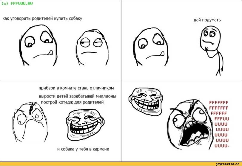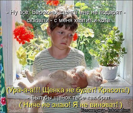 «Ну конечно, еще только этого нам не хватало! Ты поиграешь, а потом все заботы будут на мне: и гулять, и убирать за ним», «ты вон в комнате порядок навести не можешь, а за животным ухаживать надо», «от них столько шерсти, и пока привыкнет — одни хлопоты, давай отложим, сейчас не лучшее время», «тебе об учебе думать надо, вот будешь взрослым и самостоятельным — и заводи кого хочешь, а сейчас и без того куча проблем…».