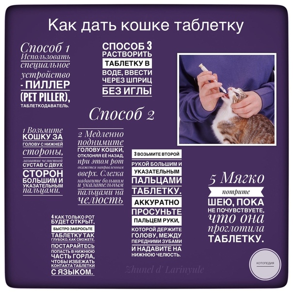 Капельница для таблеток — это небольшой механизм, который держит таблетку и бросает ее в рот кошке. Вам следует использовать капельницу для таблеток, если вы опасаетесь засовывать руку в рот кошке.Прежде чем использовать пипетку, чтобы дать кошке таблетки, лучше всего сначала приучить ее к пипетке, закапывая ей в рот какое-нибудь лакомство.