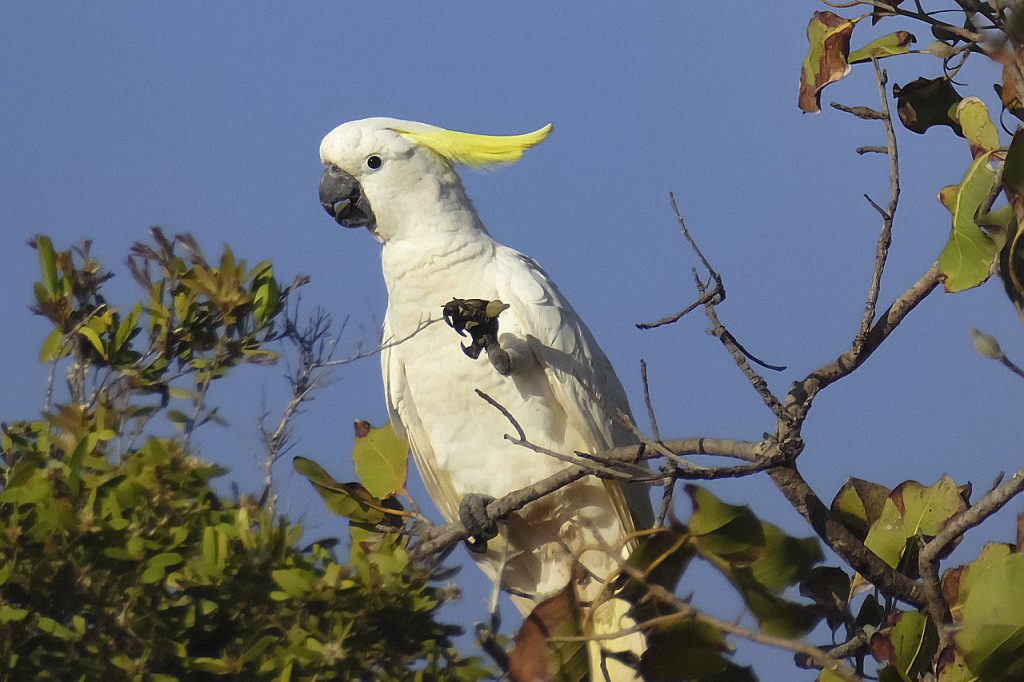 Желтохохлый какаду — еще один вид, находящийся под угрозой исчезновения, в дикой природе осталось менее 2000 особей. Вырубка лесов и отлов привели к резкому сокращению их численности. Эти птицы в основном белые с желтыми перьями на макушке. У них также есть желтые пятна над ушами.