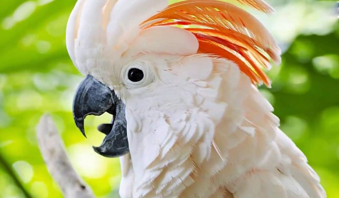 - Молуккский какаду – самый талантливый попугай из всех видов. Он способен пародировать голоса разнообразных животных и произносит до 15 слов. Средний вес самца 800 грамм, самки немного больше. Окрас перьев белый с красным хохолком.