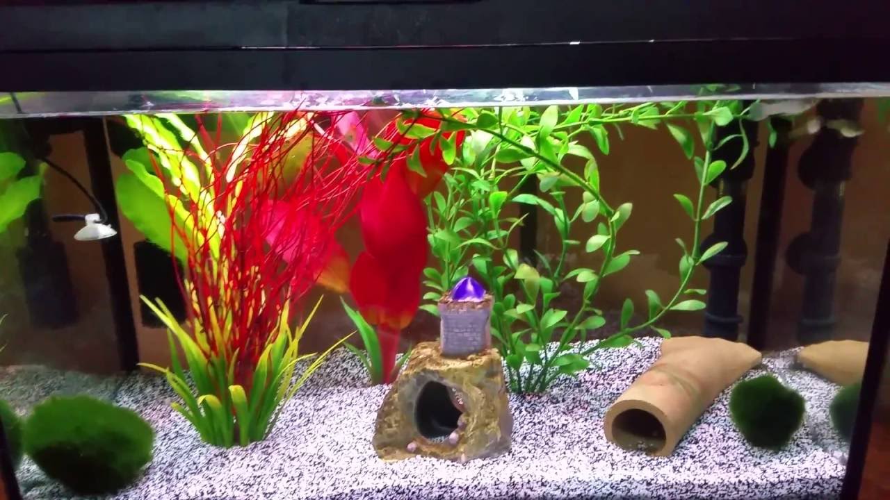 В летнее время освещение воды должно составлять 12 — 14 часов, а зимой порядка 12 ч. Избыток, света может привести к заиливанию воды и избыточному росту аквариумных растений, что для рыб не слишком хорошо. Чтобы обеспечить равномерное освещение, нужно установить лампу. Для двадцатилитрового аквариума подойдет лампа на 15 Вт.