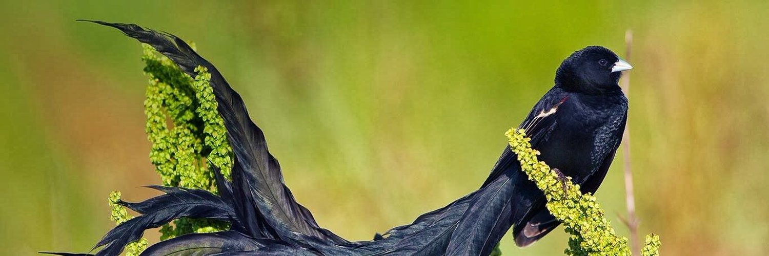 Длиннохвостые бархатные ткачи (Euplectes progne) — южноафриканские птицы, названые так из-за почти полностью черной окраски и, конечно же , чрезвычайно длинного хвоста. От шести до восьми их хвостовых перьев вырастают до более чем 50 сантиметров — примерно в три раза больше длины тела птицы. Таким оригинальным способом самцы этого вида демонстрируют здоровье и физическую форму.