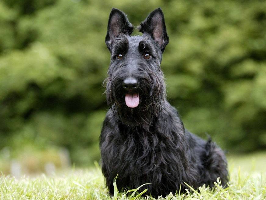 Согласно стандарту, скотч-терьеры вырастают не больше 28 сантиметров в высоту и не набирают вес больше 10,5 килограмм. Внешне эти собаки напоминают щенков ризеншнауцеров, однако в данном случае плотный и достаточно крепкий корпус расположен на очень коротких конечностях с большими лапами. Голова у скотчей довольно большая, но пропорциональная относительно корпуса, глаза овальные, небольшого размера, уши также не особенно большие – треугольного и стоячего типа. Отличительной особенностью породы является именно жесткая шерсть, которая образует характерную бороду и усы на морде, а также выразительные и пышные брови над глазами. Из-за небольшой длины конечностей шерсть этих собак опущена до самой земли.