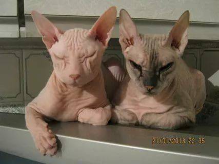 - Голорождённые. Такие особи рождаются без меха и подшёрстка. Они могут даже не иметь вибриссов (усов, бровей). Зимой такие кошки нередко обзаводятся редким мехом средней длины.