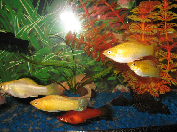 В видовом водоеме пецилии ведут себя спокойно и дружелюбно даже во время нереста, не приставая к соседям и не устраивая драк.