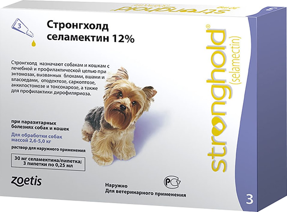 Стронгхолд капли от блох, клещей, глистов для собак 2,6-5кг 0,25мл 3 пипетки (30мг фиолетовый) — Капли — Средства от блох, клещей