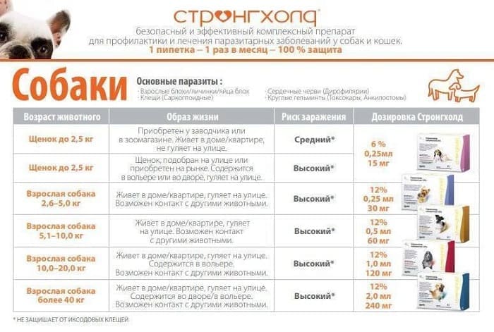 - Лечение саркоптоза у собак: «Стронгхолд» применяют двукратно с интервалом 1 месяц. В целях профилактики возможной инвазии препарат рекомендуется использовать 1 раз в месяц.
