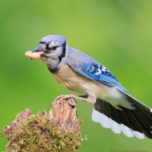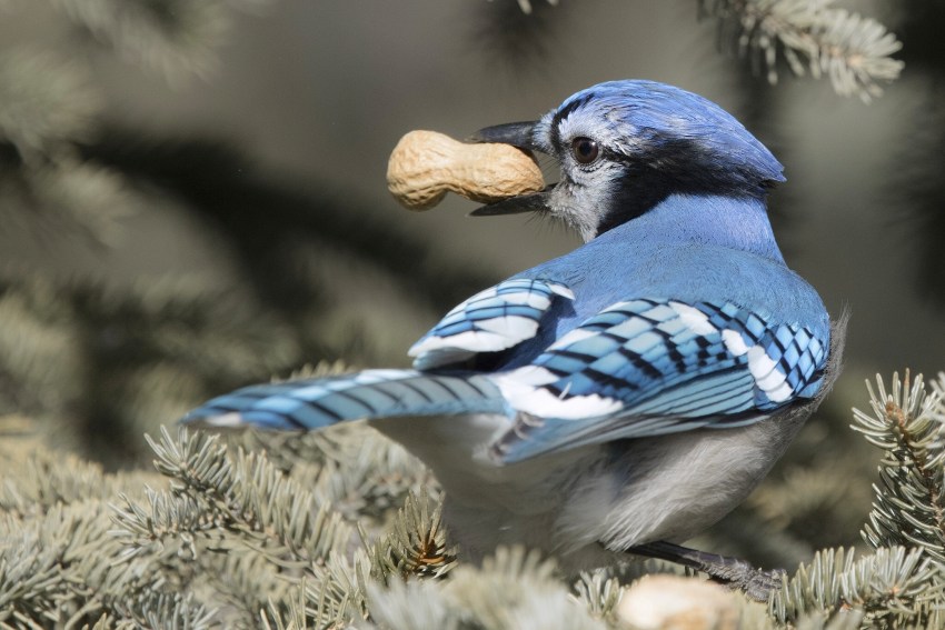 Голубая сойка, поедающая арахис