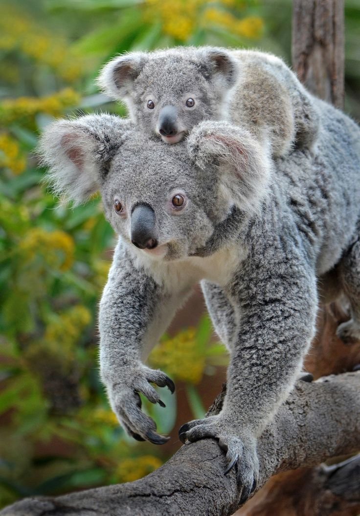 - Малыш, который взрослеет, переходит на спину к своей матери. Через 30 недель после рождения маленького мишки, когда он станет слегка больше, он уже может питаться жидкими каловыми массами, которые остаются после родителей (такое питание крайне необходимо для зверьков, ведь в нём содержатся все микроэлементы и вещества, которые очень важны для сбалансированного пищеварения маленькой коалы).