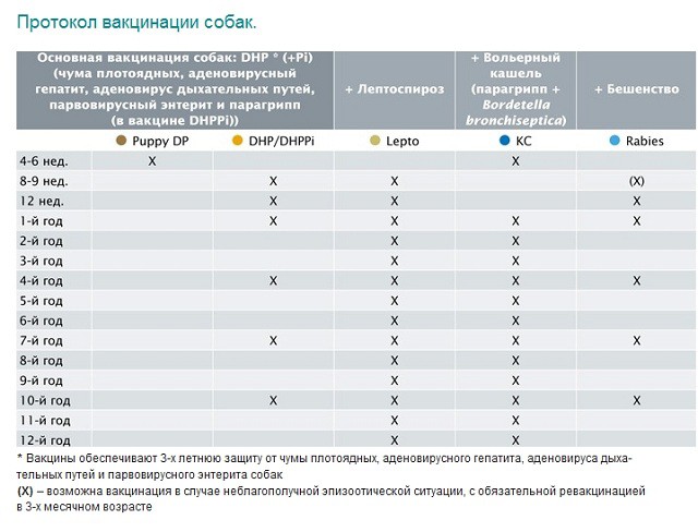 | Ревакцинация | 1 год DHP(DHPPi) + Lepto + R, далее ежегодно | |||