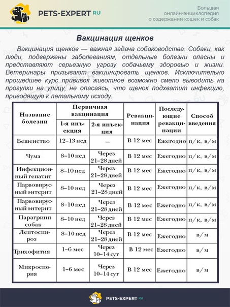 Если щенка забирают в возрасте 8 недель, и у владельцев есть возможность выдержать карантин до 12-16 недель, то вакцинацию можно начинать с 8-9 недель и проводить в два этапа: в 8-9 недель и в 12 недель. Затем в возрасте 1 года или через год в зависимости от вида вакцины, далее ежегодно.