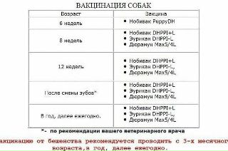 График прививок собакам, таблица по возрасту до года и после года
