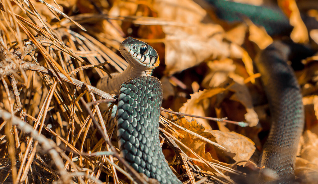Обыкновенного ужа легко узнать по светлым, желтоватым или оранжевым отметинам на голове. Фото: Sebastian_Photography / Shutterstock