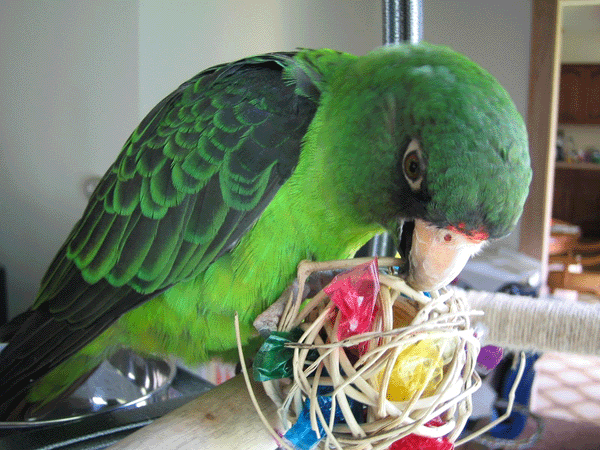 Перед покупкой птенца учитывается, что они любят доминировать над человеком, поэтому если проявить слабость, то питомец постоянно будет кусать руки и портить мебель. Поэтому необходимо грамотно организовать досуг, купив специальные игрушки, а также регулярно приносить домой веточки деревьев, о которых птица будет точить клюв.