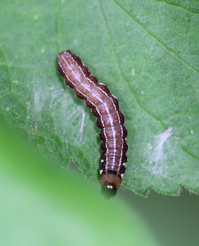 Личинки длиной до 10 см. Гусеницы после выхода из яиц мясного красного цвета, в последующем становятся желтовато-красными с коричневато-красной спиной, блестящей черной головой и спинными щитками.