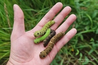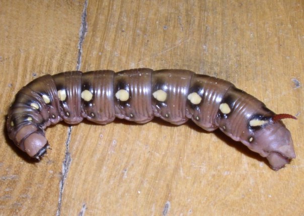 Вырастает такая гусеница до 50 мм, а окраска может варьироваться от светло-зеленого до коричневого. В некоторых регионах планеты можно встретить и черных гусениц винного бражника.