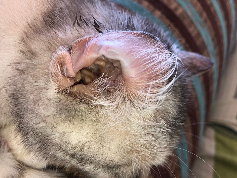 Ушной клещ, или отодектоз — частая причина черноты на поверхности ушной раковины. Клещ любит тепло и влажность. Темные точки на ухе питомца — это отмершие клетки, мертвые особи и экскременты клеща.