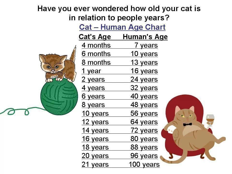 Кошки стареют не так, как люди, поэтому сложно понять, каков будет их «человеческий» возраст. Котенку исполняется год, когда он достигает 12 месяцев, а по человеческим меркам его возраст составил бы 15 лет.