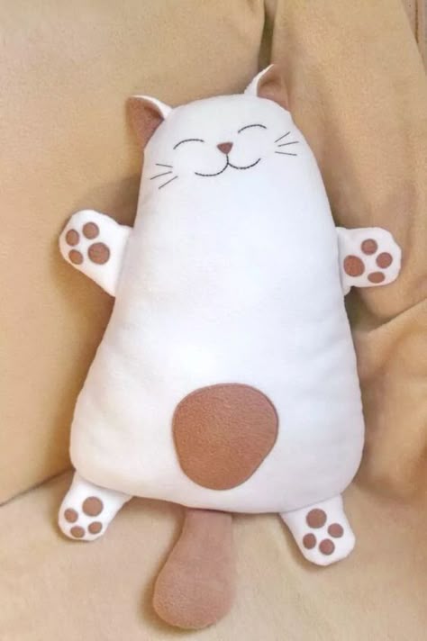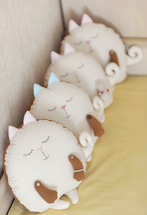 Уютного спящего котика-подушку можно также очень легко и быстро сшить. Здесь используются несложные выкройки игрушек котов из ткани. Образец поможет создать красивую игрушку.